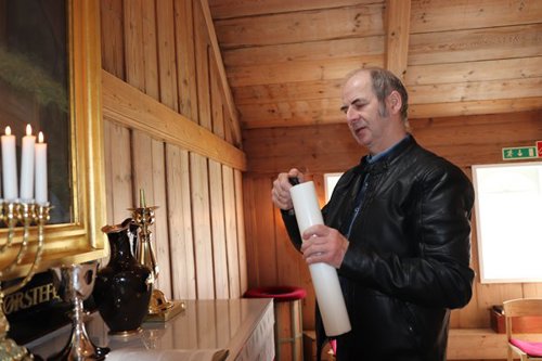 – Tað kennist gott at tendra ljósini aftur, nú kirkjan hevur verið stongd í tveir mánaðir, sigur klokkarin, Jógvan Dam, meðan hann gongur inni fyri altarinum við tendraranum. Summastaðni hava tey ringt við kirkjuklokkuni sunnumorgnar, hóast ongar gudstænastur hava verið, men soleiðis hevur tó ikki verið gjørt í Kollafirði.