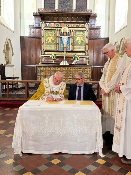 Jógvan Fríðriksson, biskupur, og Bergur Berg, fulltrúi, skrivaðu undir samstarvsskjalið millum Porvoo og Fólkakirkjuna og Almanna- og Mentamálaráðið saman við umboðum fyri Porvoo, Michael Jackson erkabiskupi og Matti Repo, biskupi.