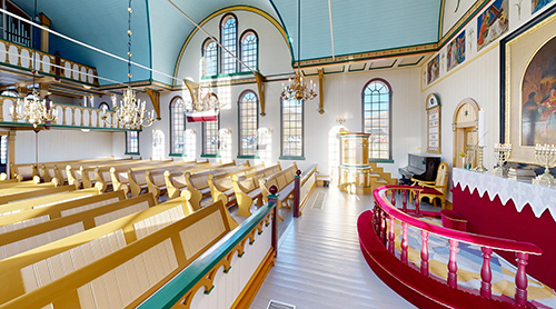 Á kórvegginum uppi yvir altarinum eru sjey málningar, sum Kristin í Geil hevur málað eftir gomlum kirkjumálningum.